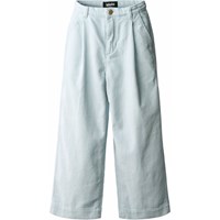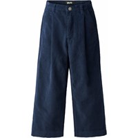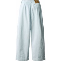 Hellblaue Hose aus weichem Baumwoll-Velvet in lockerer Passform. Die Hose ist leicht hoch geschnitten mit weiten Beinen und Falten vorne, die eine schöne Silhouette schaffen. Sie hat zwei Seitentaschen und eine einzelne Gesäßtasche. Der Bund wird mit einem Knopf und Reißverschluss geschlossen und hat innen einen verstellbaren Gummizug für eine gute Passform.