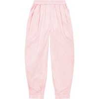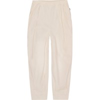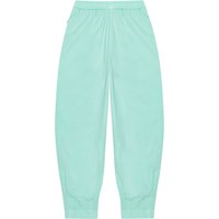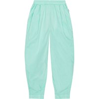 Mintgrüne Baumwollhose. Die Hose hat einen Gummizug in der Taille, der das Anziehen erleichtert und angenehm zu tragen ist, sowie eine Falte vorne, die der Hose Fülle verleiht. Die Hose hat Taschen in der Seitennaht und einen eingenähten Schnitt an der Unterseite der Hose, der für einen voluminösen Effekt sorgt.