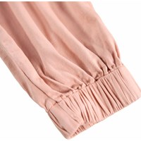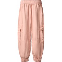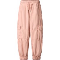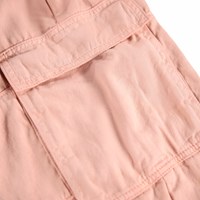 Rosa Baumwoll-Twill-Hose. Der Bund der Hose ist elastisch mit Kordelzug, sie hat paspelierte Taschen vorne und zwei aufgesetzte Taschen mit Taschenklappen an jeder Seite des Oberschenkels. Die Hose hat elastische Bündchen unten, die der Hose Volumen verleihen.