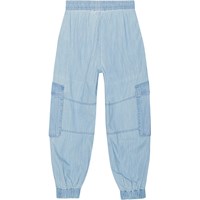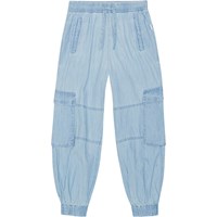 Hose mit Patina aus hellblauer Baumwolle. Der Bund der Hose ist elastisch mit Schnürung, Paspeltaschen vorne und zwei aufgesetzte Taschen mit Taschenklappen auf jeder Seite des Oberschenkels. Die Hose hat unten einen Gummizug und verleiht der Hose Volumen.