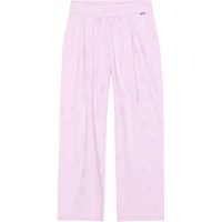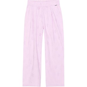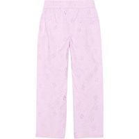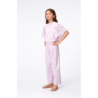 Hose aus hellvioletter Öko-Baumwolle. Das Material der Hose ist eine Anglaise-Stickerei mit gleichfarbigem Futter. Die Hose hat einen Gummizug in der Taille, der das Anziehen erleichtert und angenehm zu tragen ist, sowie eine Falte vorne, die der Hose Fülle verleiht.