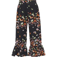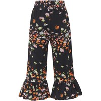 Anise ist eine schwarze Culotte-Hose mit Prints von kleinen verschiedenen Blumen. Die Hose hat unten eine Rüschenkante und einen elastischen Bund, der für eine bequeme Passform sorgt.