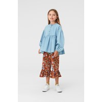 Anis ist eine braune Culotte-Hose mit Druck von wilden Blumen und kleinen Insekten. Die Hose hat unten eine Rüschenkante und eine elastische Taille, die für eine bequeme Passform sorgt.