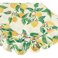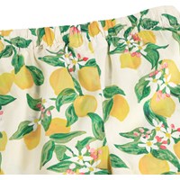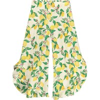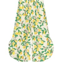 Gelbe Hose mit Zitrusdruck aus Bio-Baumwolle. Die Hose hat Rüschen, ist luftig, hat eine lockere Passform, einen seitlichen Reißverschluss und einen elastischen Bund hinten.