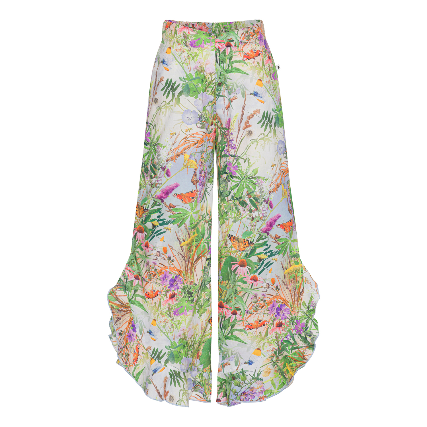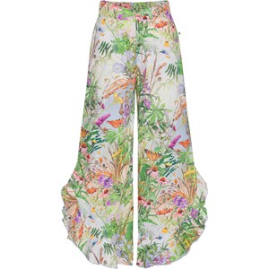 Lange, luftige Hose mit mehrfarbigem Allover-Print aus leichter 100% Öko-Baumwolle. Der Druck zeigt eine wunderschöne Blumenwiese mit Schmetterlingen. Die Taille der Hose ist hinten elastisch und die Beine haben einen geschwungenen Rand mit Rüschen und Schlitzen an der Seite, die zusammen das An- und Ausziehen der Badebekleidung erleichtern.