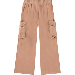 Braune Hose aus Öko-Baumwolle. Die Hose hat auf jeder Seite des Oberschenkels aufgesteppte Taschen. Der Bund der Hose ist vorne fest und hinten elastisch, was für eine gute Passform und einfaches Anziehen sorgt. Die Hose hat vorne weite Beine, was ihr Weite und einen lässigen Look verleiht.