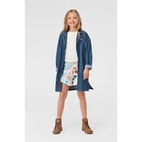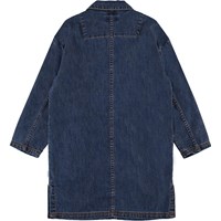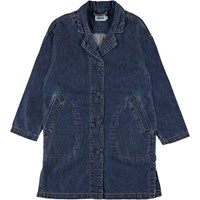 Hana ist eine lange blaue Jeansjacke mit einem Knopfverschluss vorne. Die Jacke hat große aufgenähte Taschen vorne und Schlitze an den Seiten.