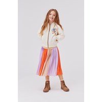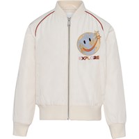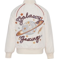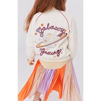 Hatty ist eine weiße Bomberjacke mit einem schönen Galaxy-Print auf dem Rücken und auf der Brust. Die Jacke hat schöne dunkelrote Paspeln.