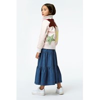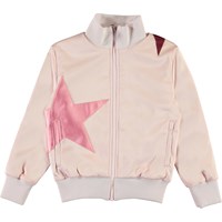 Hazel ist eine rosa Bomberjacke mit aufgenähten großen Sternen in tollen Farben. Die Jacke hat unten, sowie am Hals, und am Ärmelverschluss eine Rippkante.