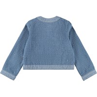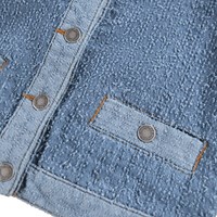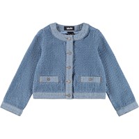 Blaue Bouclé-Denimjacke aus weicher Baumwolle. Die Jacke hat feine Details, kleine Taschen vorne und einen Knopfverschluss. Kombinieren Sie sie mit dem passenden Rock.