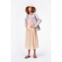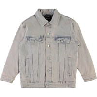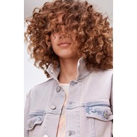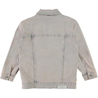 Helene ist eine helle Denim-Jacke in verwaschenem Blau und Rosa. Die Jacke hat einen Knopfverschluss und Taschen auf der Brust und an der Seite.