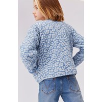 Henny ist eine hellblaue Kurzjacke mit Leopardenmuster. Die Jacke ist gesteppt und hat einen Knopfverschluss.