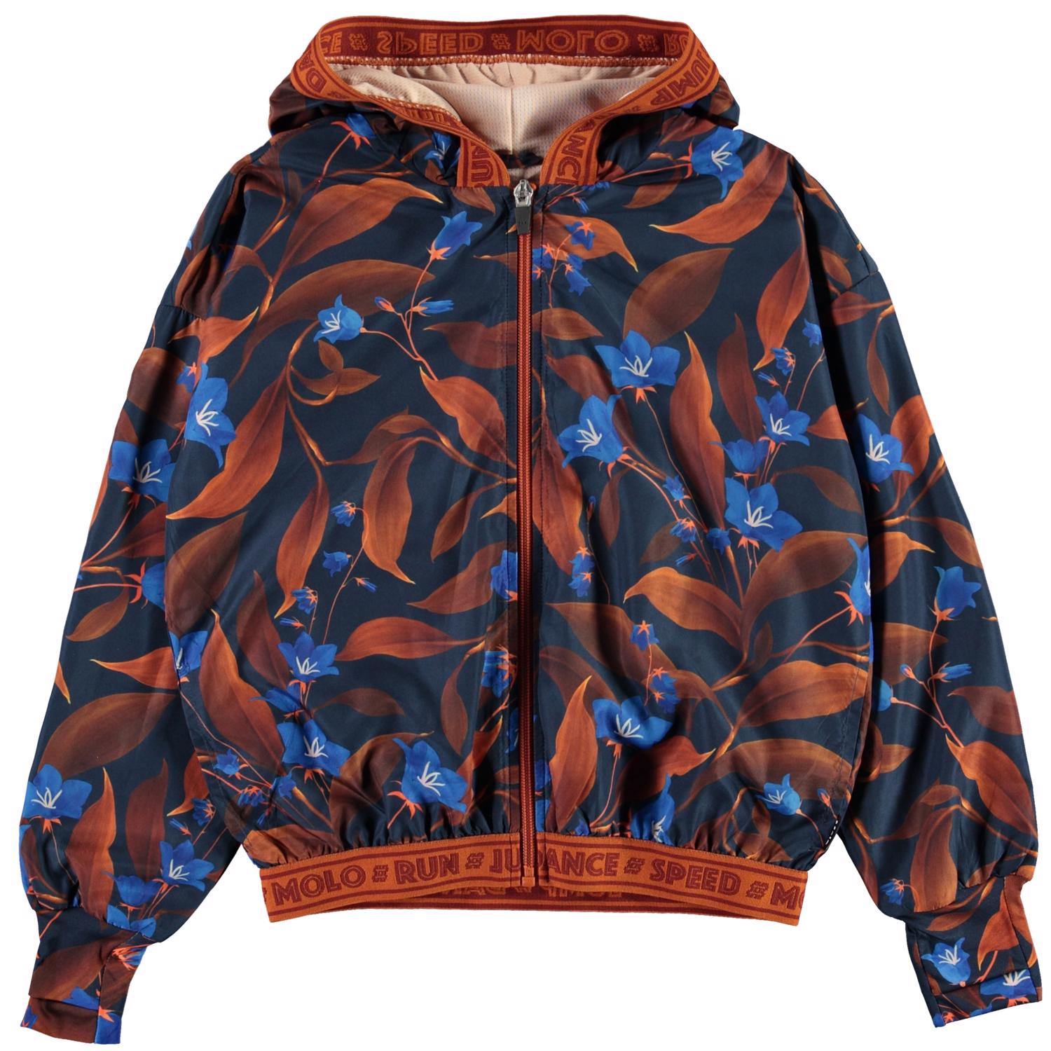 Ophelia ist eine luftige Sportjacke in Dunkelblau mit Drucken von braunen Blättern und Blüten. Die Jacke hat einen Reißverschluss und eine Kapuze sowie eine braune Kante mit Text. Die Jacke ist Teil der Sportkollektion von Molo, die Mode und Sport enger zusammenhält. Kombiniere Ophelia mit einem der passenden Styles aus Molos Sportkollektion für einen vollständigen und coolen Look. Die Sportkollektion von Molo basiert auf einer einzigartigen Hochleistungstechnologie namens HeiQ Smart Temp, die die natürliche Kühlung des Körpers unterstützt. Die Kühlfunktion wird aktiviert, wenn Tauben heiß und verschwitzt sind. Die Kühlfunktion wird deaktiviert, wenn der Körper abgekühlt ist. HeiQ Smart Temp sorgt für optimalen Komfort und Leistung. Unabhängig getestet als hautsicher.