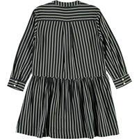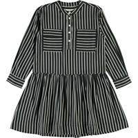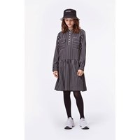 Cacao ist ein Hemd-Kleid mit vertikalen blauen und weißen Streifen. Das Kleid hat lange Ärmel, Fronttaschen und Knopfverschluss am Hals.