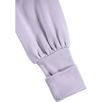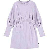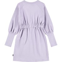 Hellvioletter Sweatshirt-Kleid aus weicher Öko-Baumwolle. Das Kleid hat ein breites Gummiband um die Taille und lange gerippte Bündchen an den Ärmeln, die hochgekrempelt werden können, um einen schönen Effekt zu erzielen.