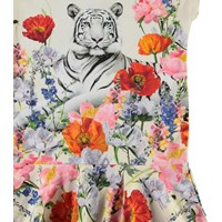 Caeley ist ein helles Kleid mit einem Druck von einem weißen Tiger, der zwischen vielen Blumen liegt. Ecocert Greenlife, certifikationsnr. 197496