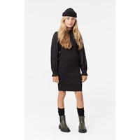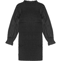 Sophisticatedes, knielanges schwarzes Kleid aus weicher Viskose mit Raffungen, die für eine eng anliegende Passform sorgen. Lange Ärmel mit Raffungen an den Handgelenken und gerafften Schultern. Das Kleid ist dank seines elastischen Designs einfach anzuziehen und angenehm zu tragen. Der runde Ausschnitt ist elegant mit einer zarten Rüsche verziert.