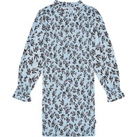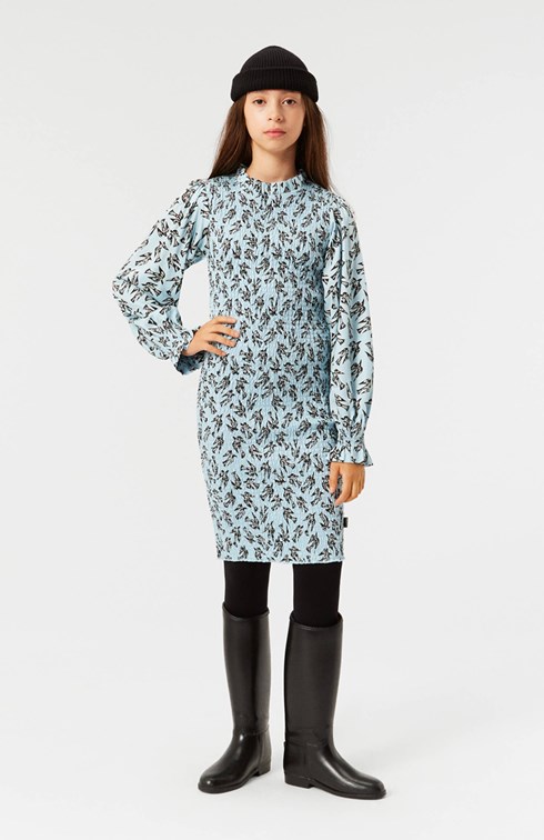 Sophisticatedes, knielanges hellblaues Kleid aus weicher Viskose mit Raffungen, die für eine bequeme Passform sorgen. Lange Ärmel mit Raffungen an den Handgelenken und gerafften Schultern. Das Kleid ist dank seines elastischen Designs einfach anzuziehen und angenehm zu tragen. Der runde Ausschnitt ist elegant mit einer zarten Rüsche verziert. Das Kleid hat ein Allover-Muster mit wunderschönen schwarzen Kunstvögeln, die auf einem hellblauen Hintergrund fliegen.