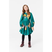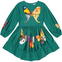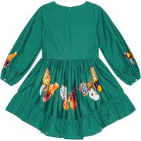 Knielanges grünes Baumwollkleid mit rundem Ausschnitt, langen Ärmeln, Knöpfen und Manschetten sowie einer Taillennaht. Der Rock hat großzügige Falten und eine zusätzliche Rüsche am Saum, die ihn im weichen Baumwollstoff wunderschön fallen lässt. Das Kleid ist mit einem Druck von bunten Schmetterlingen in verschiedenen Formen und Farben versehen.