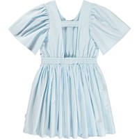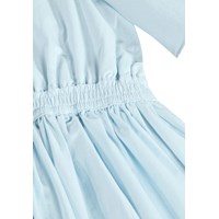 Hellblaues knielanges Kleid aus Bio-Baumwolle mit rundem Ausschnitt und weiten T-Shirt-Ärmeln mit feinen Raffungen. Der offene Rücken ist elegant mit einem Gummiband gerafft, und ein Gummizug in der Taille verleiht dem Kleid Form und fügt dem Rock eine leichte Fülle hinzu.