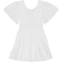 Weißes knielanges Kleid aus Öko-Baumwolle. Das Kleid hat einen Rundhalsausschnitt, Ärmel mit vielen Rüschen und einen offenen Rücken, der durch ein Gummiband zusammengehalten wird. Durch den elastischen Bund erhält der Rock des Kleides mehr Volumen und es lässt sich leicht anziehen und angenehm tragen.