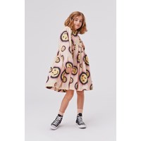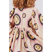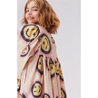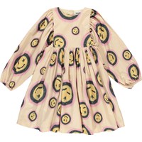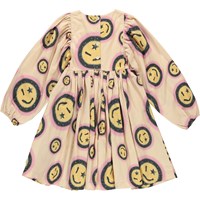 Caly ist ein hellgelbes Kleid mit langen Ärmeln und einem Rock mit großem Volumen. Das Kleid hat Aufdrucke von Smileys mit einem solchen Stern darin.
