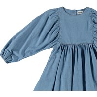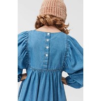 Caly ist ein blaues Jeanskleid mit langen Ärmeln und einem Rock mit großem Volumen. Das Kleid hat einen Knopfverschluss am Hals.
