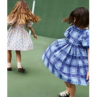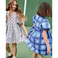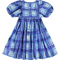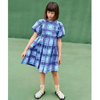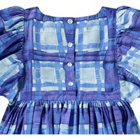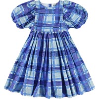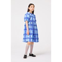 Kariertes Kleid in Blautönen aus Öko-Baumwolle mit einem runden Ausschnitt. Das Kleid hat eine lockere Passform, Ärmel mit vielen Raffungen und elastischen Abschlüssen sowie einen Verschluss hinten mit vier Knöpfen.
