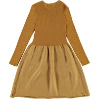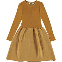 Cameron ist ein goldenes Kleid mit Glimmer. Das Kleid hat lange Ärmel und einen runden Halsausschnitt.