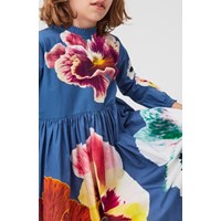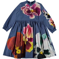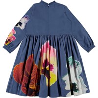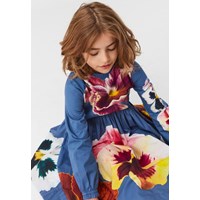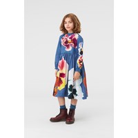 Cami ist ein wunderschönes blaues Popelinekleid mit einem Druck aus großen Blumen auf der Vorder-, Rückseite und den Ärmeln. Das Kleid hat ein schönes Volumen und einen kleinen Faltenkragen sowie einen Reißverschluss am Hals.