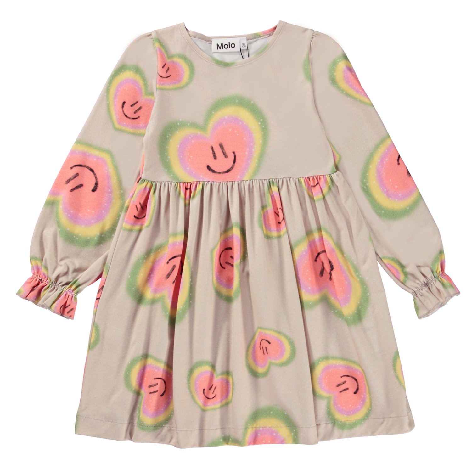 Beiges, knielanges Kleid mit Allover-Aura-Herzdruck. Stelle Dir vor, dass alles eine Aura hat – Menschen, Pflanzen und Tiere. Der Druck besteht aus Aura-Herzen, die vor Farben, Lächeln und Liebe strahlen. Aurafarben, die wie die Farben des Regenbogens sind, die Farben und Emotionen in unserem Körper, unserem inneren Wesen, widerspiegeln. Wir sind bereit, unser Herz für alles zu öffnen, was wir nicht sehen können, und zu glauben, dass es zwischen Himmel und Erde noch mehr gibt. Dieses Kleid ist aus 100% Baumwolle, hat einen Rundhalsausschnitt, lange Ärmel mit Rüschendetails, eine hohe Taille, einen Rock mit viel Schwung und eine lockere Passform.