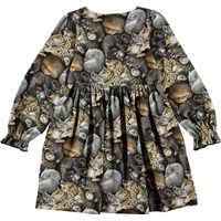 Camie ist ein Kleid mit Aufdrucken verschiedener Tiere, die sich zusammengerollt haben und tief schlafen. Das Kleid hat einen elastischen Taillen- und Armabschluss.