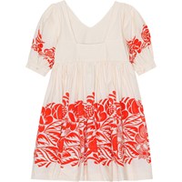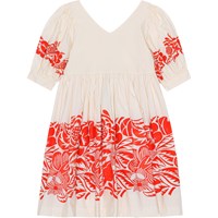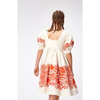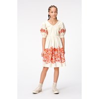 Weißes knielanges Kleid aus Öko-Baumwolle. Der Ausschnitt des Kleides verläuft in einem V, Puffärmel mit Manschetten und Knopfverschluss hinten. Das Kleid hat einen Schnitt in der Taille mit vielen Rüschen, die dem Kleid Volumen verleihen, und einen unsichtbaren Reißverschluss in der Seitennaht, der das An- und Ausziehen erleichtert. Die Ärmel und der Rock des Kleides sind mit einem kunstvollen Blumendruck in Orange-Rot versehen.