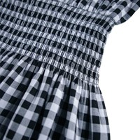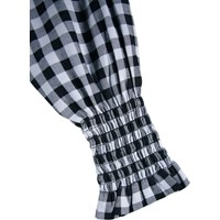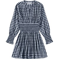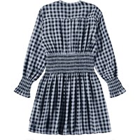 Langärmeliges blaues kariertes Kleid aus Viskose. Das Kleid hat einen V-Ausschnitt, ist knielang und verfügt über ein breites gesmoktes Panel um die Taille und Ärmel.