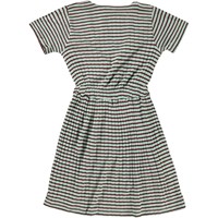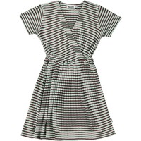 Canal ist ein blau-braun gestreiftes Rippkleid aus 100 % Viskose. Das Kleid ist ein Midikleid mit kurzen Ärmeln und das Oberteil hat einen Wickeleffekt.