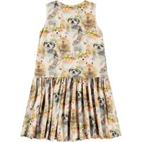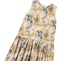 Rosa Kleid aus weichem Öko-Baumwolljersey mit Rundhalsausschnitt und Taillennaht. Das Kleid hat eine lockere Passform, ein Oberteil mit breiten Trägern und ein Allover-Print süßer Tiere mit Blumenkränzen auf ihren Köpfen.