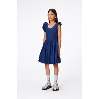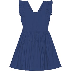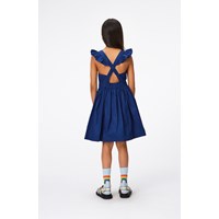 Dunkelblaues, knielanges Kleid aus Öko-Baumwolle. Das Kleid hat einen tiefen Rundhalsausschnitt, am Armloch befindet sich eine angenähte Rüschenkante, die einen kleinen Rüschenärmel bildet. Der Rücken ist offen mit überkreuzten Trägern und einem elastischen Teil in der Taille, wodurch er gut sitzt und das Anziehen erleichtert. Der Taillenteil ist vorne mit vielen Rüschen fixiert und verleiht dem Rock ein schönes Volumen.