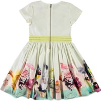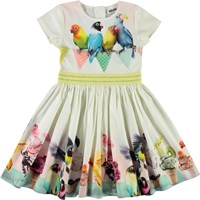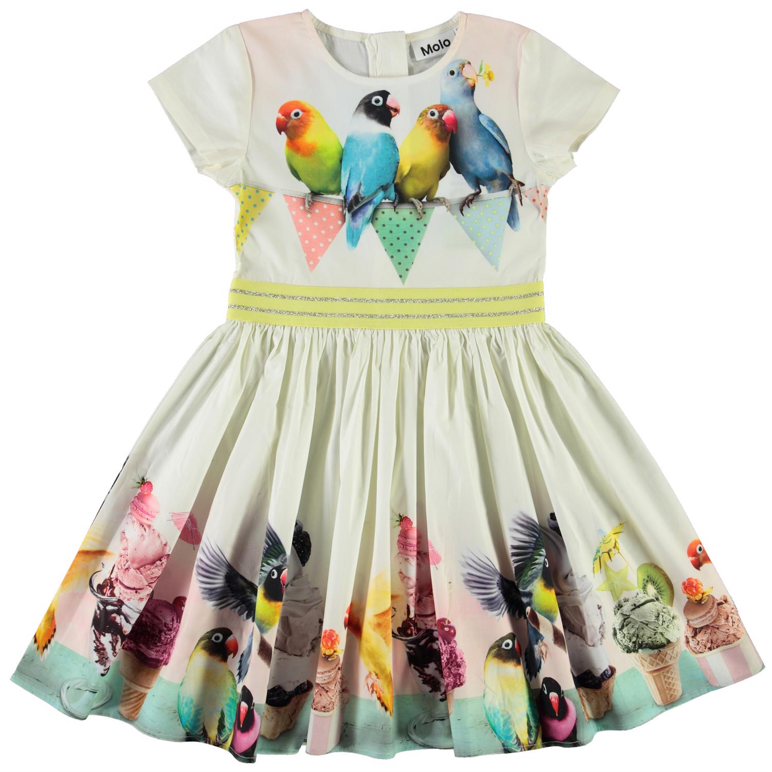 Candy ist ein Popeline-Kleid mit Stretch, das es unglaublich angenehm zu targen macht. Candy ist mit kurzen Ärmeln und mit Druck von Vögeln, die verschiedenen Eisdesserte genießen. Das Kleid hat einen Reißverschluss im Nacken und ein gelbes Taillenband. Ecocert Greenlife, certifikationsnr. 197496