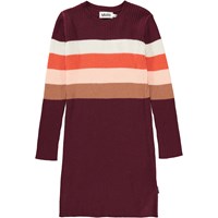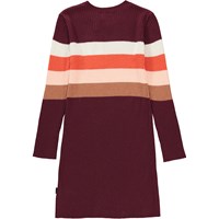 Cara ist ein weinrotes Strickkleid mit Streifen. Das Kleid hat lange Ärmel und einen Rundhalsausschnitt.