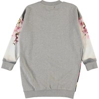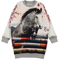 Carita ist ein langärmeliges Sweatshirt-Kleid in Baumwolle. Auf der Vorderseite hat das Kleid ein Druck von einem Pferd das über einige Hindernisse springt, sowie einen Blumen-Druck auf den Ärmeln.