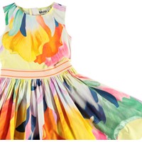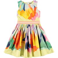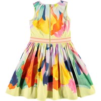 Carli ist ein gelbes Kleid ohne Ärmel und mit Blumenmuster. Das Kleid ist aus Popeline mit Stretch-Einsatz, wodurch es unglaublich angenehm zu tragen ist.