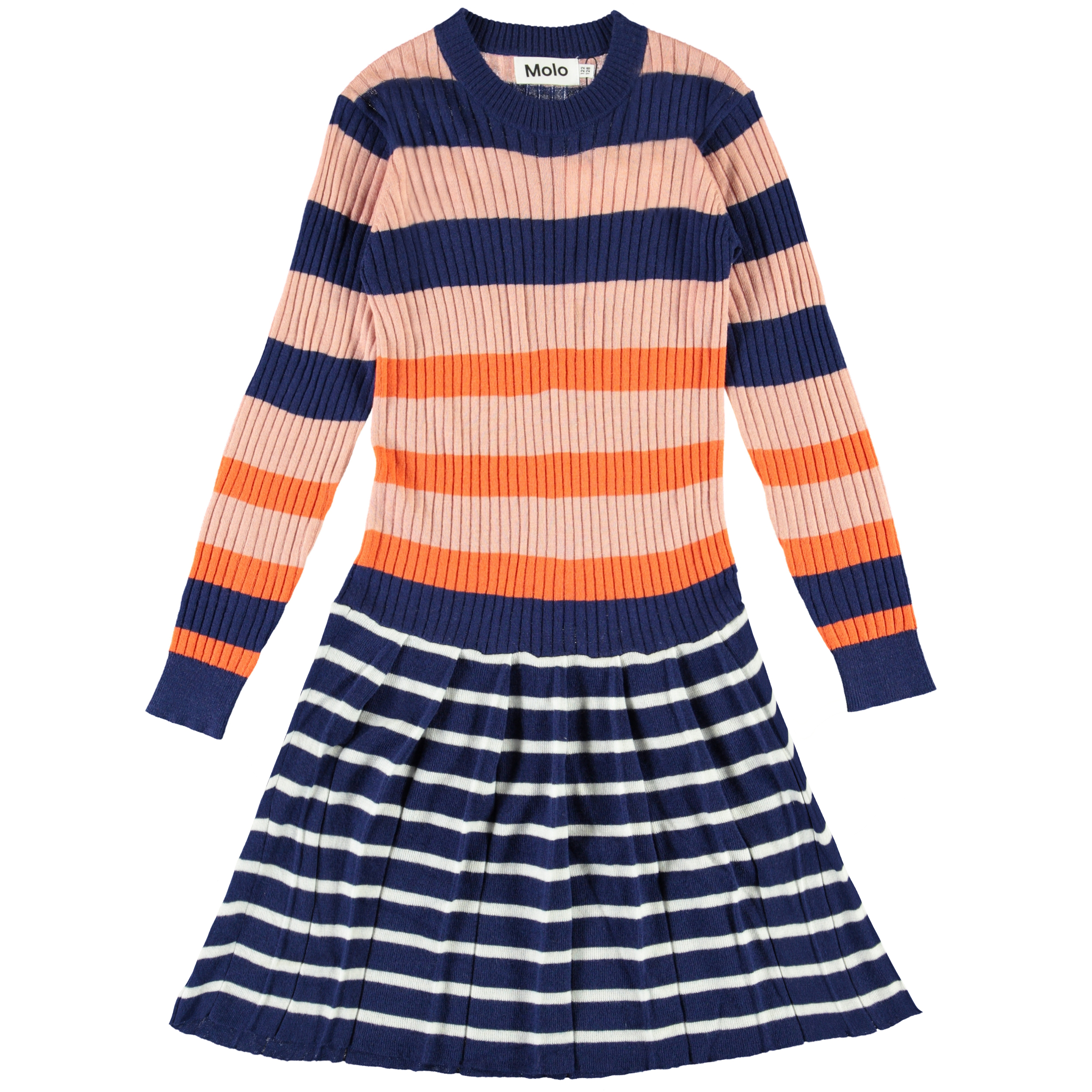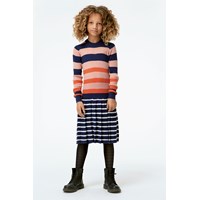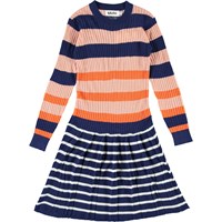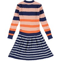 Carlin ist ein Strickkleid, oben mit breiten Streifen in Orange, Blau und Rosa, und unten mit schmalen Streifen in Blau und Weiß. Das Kleid hat lange Ärmel und einen runden Halsausschnitt.