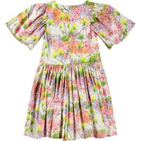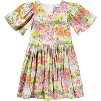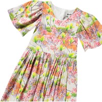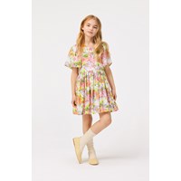 Weißes knielanges Kleid aus weichem Viskose mit rundem Ausschnitt und Schmetterlingsärmeln. Das Kleid hat eine lockere Passform mit einem Reißverschluss auf der Rückseite und einem Allover-Druck bunter Blumen.