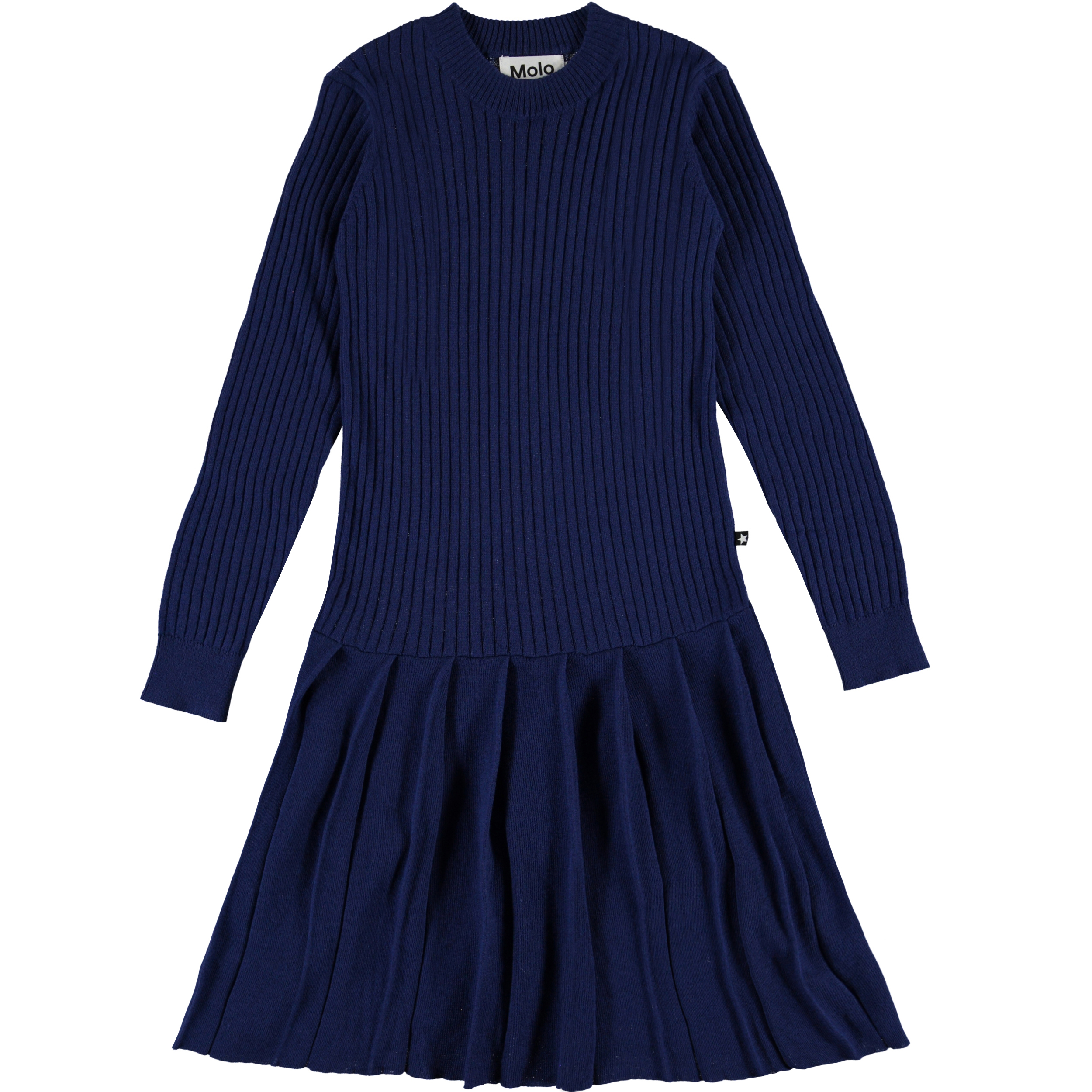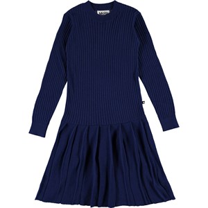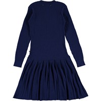 Carlin ist ein Strickkleid in Dunkelblau. Das Kleid hat lange Ärmel und einen runden Halsausschnitt.