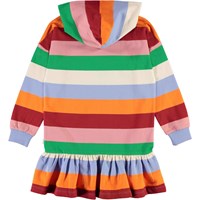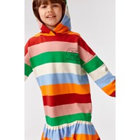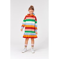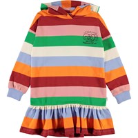 Carma ist ein gestreiftes Sweatshirtkleid mit Kapuze. Das Kleid hat einen Print von drei Emojis auf einer Brust und einen kleinen Rock.