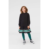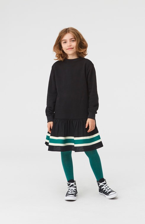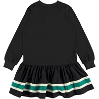 Carmen ist ein schwarzes Kleid mit einem kleinen Rock mit grünen und weißen Streifen unten. Das Kleid hat lange Ärmel und ist schön weich zu tragen.