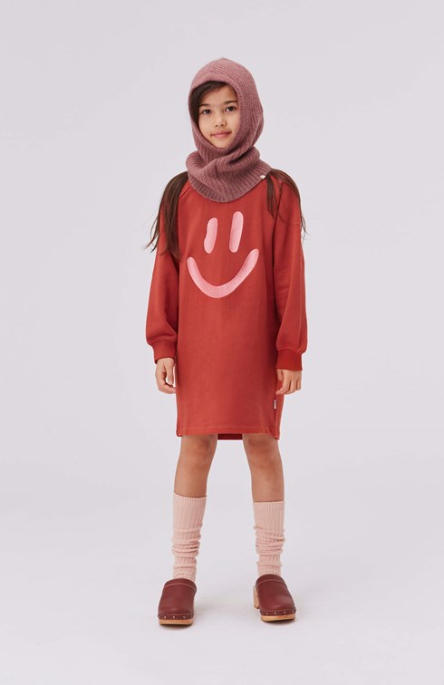 Carola ist ein rotes Sweatshirtkleid mit langen Ärmeln. Das Kleid hat einen Aufdruck eines rosa Smileys auf der Vorderseite.