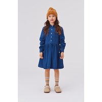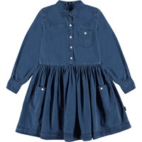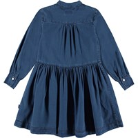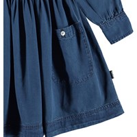 Carolyn ist ein dunkelblaues Jeans-Hemdkleid mit Knöpfen auf der Vorderseite sowie einer Brusttasche und aufgesetzten Taschen am Rock.