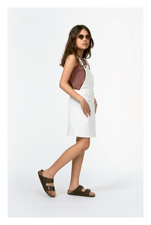 Carolyn ist ein weißes Kleid in Denim. Die Träger des Kleides können in der Länge angepasst werden. Das Kleid wird auf der einen Seite mit Knöpfen geschlossen und hat eine große Tasche in der Mitte der Brust sowie normale Jeanstaschen.