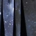 Langärmeliges schwarzes Kleid aus Öko-Baumwolle mit einem eng anliegenden gerippten Oberteil, einem Rundhalsausschnitt und einem voluminösen, kreisförmig geschnittenen Rock aus Baumwollflanell. Der Rock hat einen Galaxie-Druck.